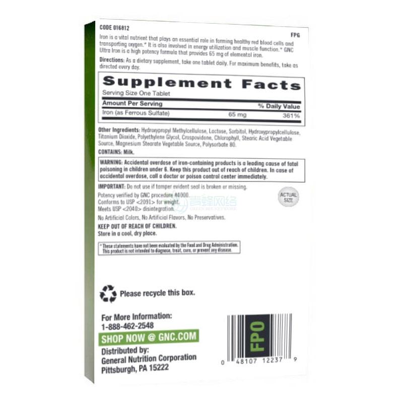 美国GNC健安喜铁元素片65mg×100片